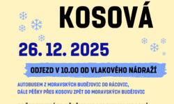 Turistický oddíl srdečně zve všechny příznivce turistiky na tradiční vánoční pochod na Kosovou, který se uskuteční 26. prosince 2025. Sraz účastníků je v 10:00 u vlakového nádraží, odkud společně vyrazíme autobusem do Rácovic. Odtud se pěšky vydáme přes Kosovou a zpět do Moravských Budějovic. Celková délka trasy je přibližně 12 kilometrů. Na kiosku na…