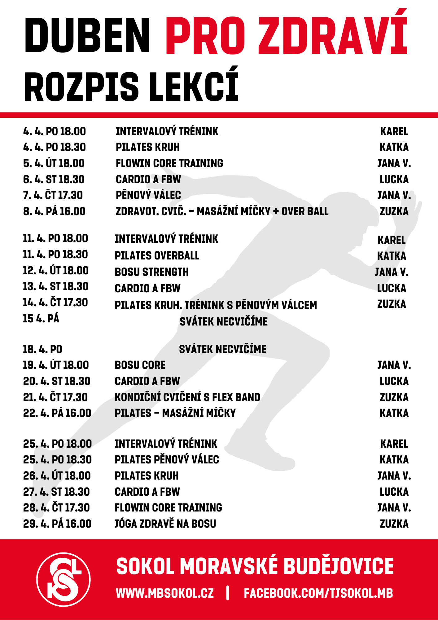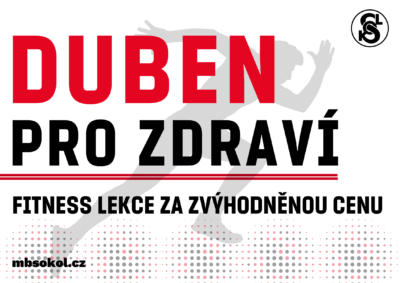 Na měsíc duben jsme pro vás připravili akci fitness lekce za zvýhodněnou cenu. Členům Sokola se bude škrtat půl políčka z permanentky, veřejnost zaplatí 50,- Kč za lekci. Každý týden si budete moct vyzkoušet jiné cvičební pomůcky, díky kterým je cvičení efektivnější. Povedou vás naši zkušení lektoři. Vybrat si můžete z pestré nabídky. Budeme se na vás těšit!