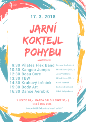 V sobotu 17.3. pro vás chystáme tradiční Jarní koktejl pohybu. Dostaňte se do formy, načerpejte energii a dobrou náladu s našimi lektory a s Míšou Exlovou. Připravili jsme pro vás pestrou sportovní nabídku. První lekce začíná v 9:30h.