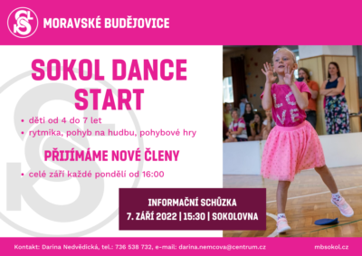 SOKOL DANCE START – mladší skupina od 3 do 5 let a starší skupina od 6 do 8 let , rytmická průprava, pohyb na hudbu, pohybové hry pod vedením Radky Houserkové a Adély Bulíčkové.