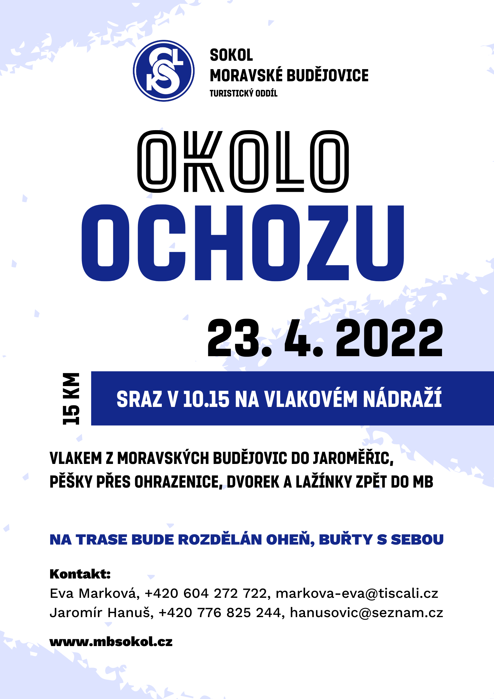 Sraz v 10.15 na vlakovém nádraží. Odtud vyrazíme vlakem do Jaroměřic a dále budeme pokračovat pěšky přes Ohrazenice, Dvorek a Lažínky zpět do Moravských Budějovic. Délka trasy je 15 km. Na trase bude možnost opéct si špekáčky. Pochod zakončíme posezením a občerstvením v Bowling sport baru.