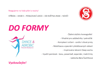Dostaňte se do formy s komplexním cvičením – cardio i silové prvky, žádné složité choreografie, vhodné pro všechny. Každoustředu v 19h s Bárou Švaříčkovou v sokolovně.