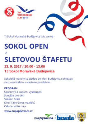 Po roce pro vás opět chystáme akci Sokol Open. Letoší ročník bude spojen s župní akademií, celá akce tedy proběhne v daleko větším rozsahu, než jste zvyklí. Do Moravských Budějovic se sjedou zástupci jednot župy plk. Švece, aby nám předvedli, co umí. Zároveň přivezou sletovou štafetu s vlastním poselstvím.