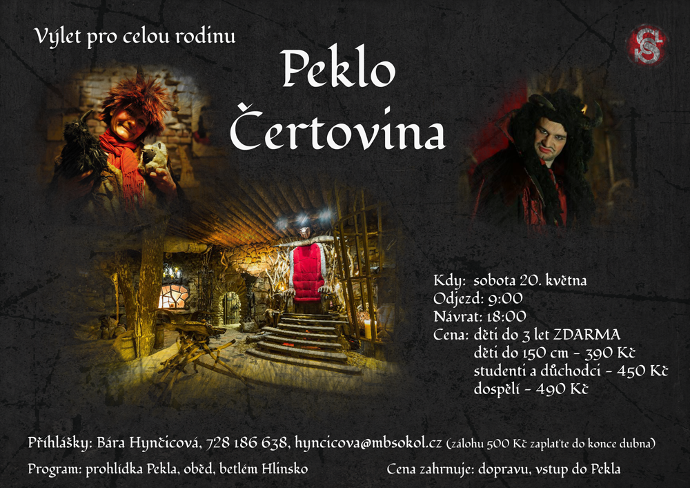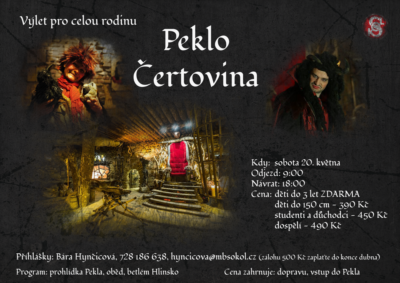 Pojeďte se s námi podívat do Pekla. 20. května pořádáme výlet pro celou rodinu. Uhrazení zálohy je možné do konce dubna u Barbory Hynčicové, email hyncicova@mbsokol.cz. Záloha slouží zároveň jako přihláška. Podrobnosti na facebooku.