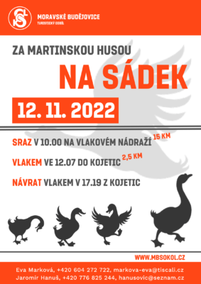 Zveme všechny příznivce pěší turistiky na tradiční pochod na Sádek, který se uskuteční 12. 11. 2022. Sraz účastníků bude v 10.00 na vlakovém nádraží (odjezd 10.23).